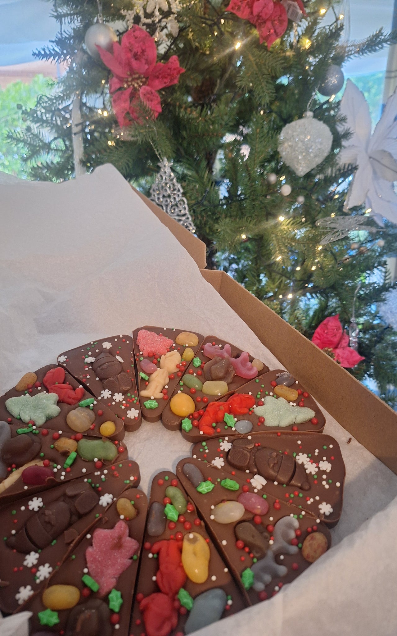Indulge in a sweet Christmas treat with our 11 slice milk chocolate pizza, topped with festive themed sweets.