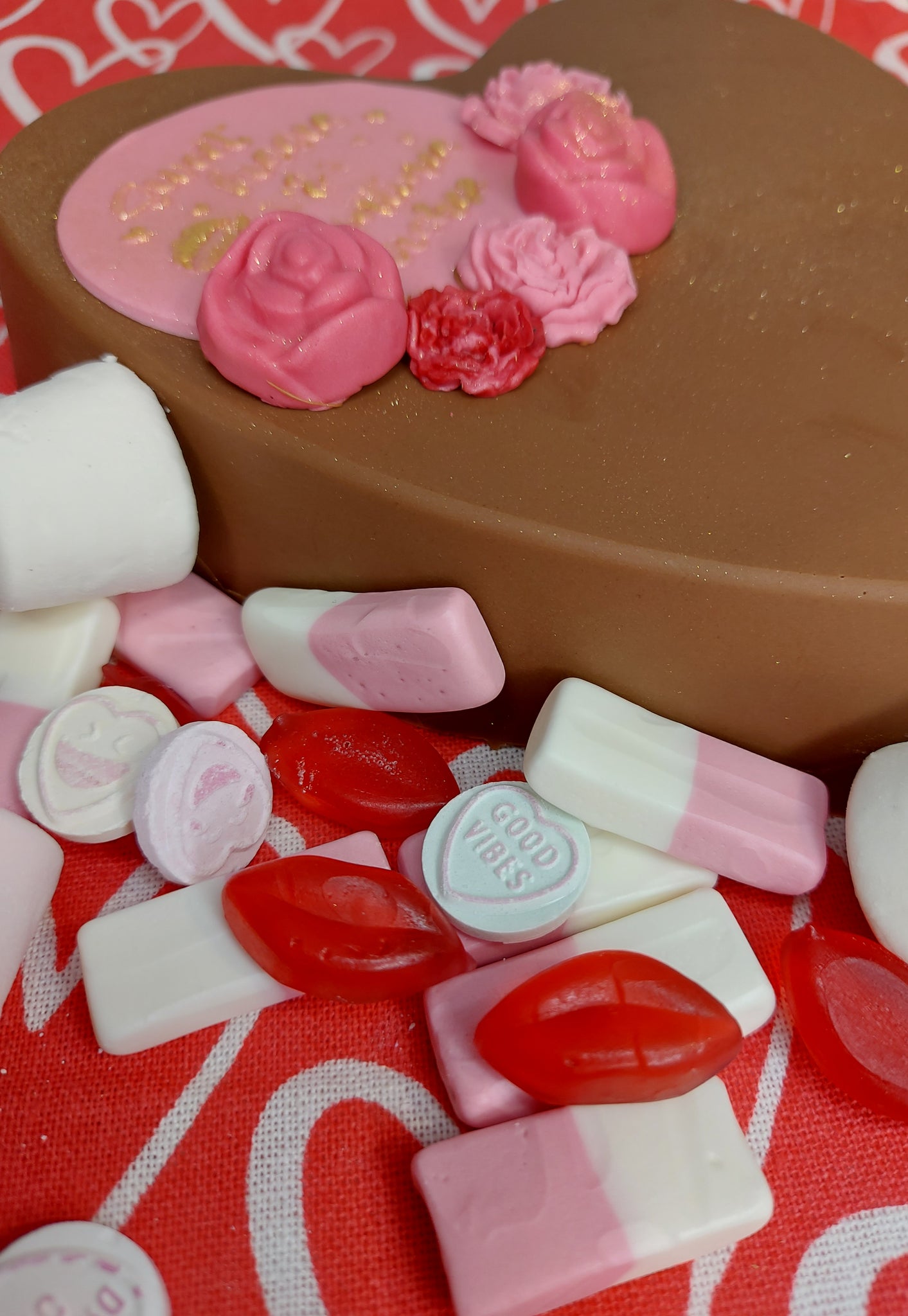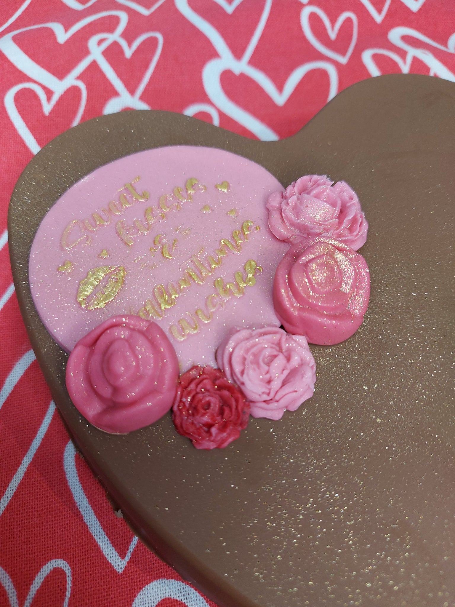 Handmade chocolate heart topped with valentines message - Sweet kisses and valentines wishes' with fondant icing flowers.